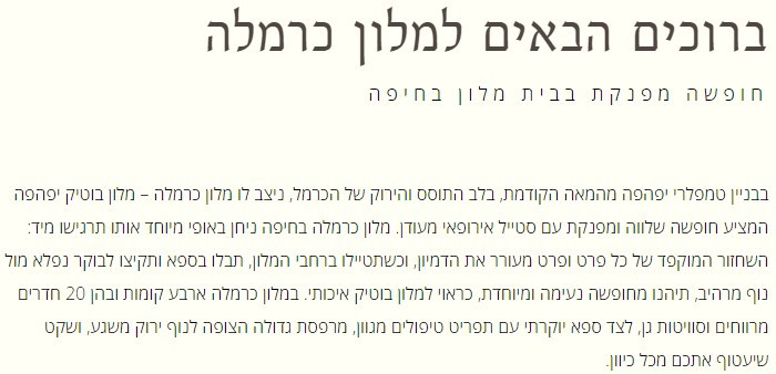מלון כרמלה ממוקם בבניין טמפלרי יפהפה מהמאה הקודמת, בלב התוסס והירוק של הכרמל בחיפה. לאחר ששוחזר בקפידה, קיבל המלון תוכן ייחודי ומדויק שנכתב בהתאם לאופיו הבוטיקי.